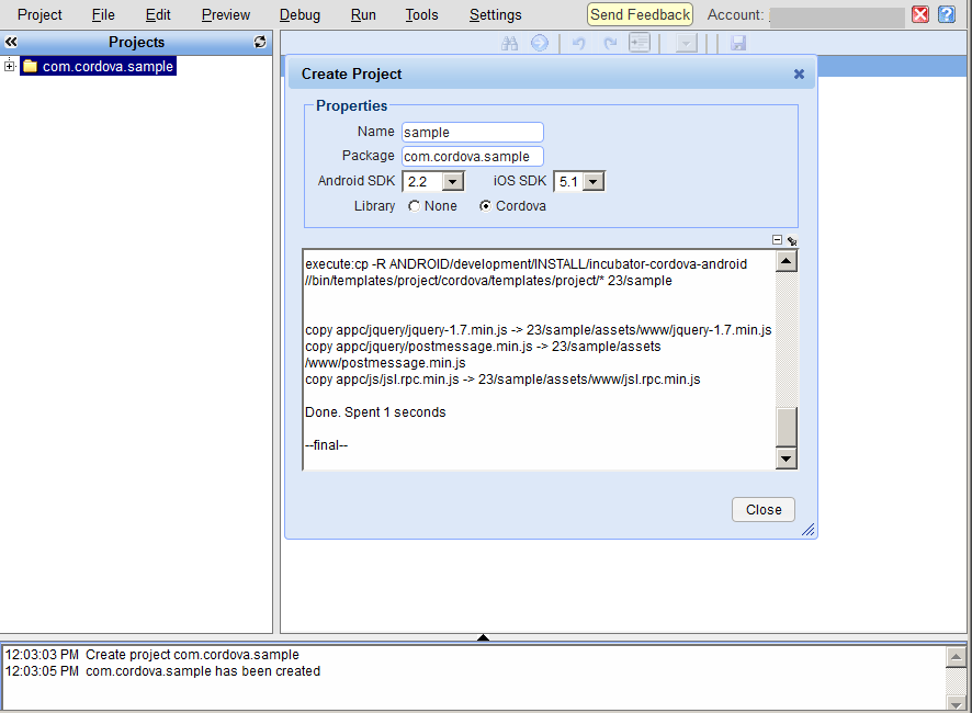 After entering the Name, click the dialog Submit button to create the project. The Appception IDE will then display project creation information.